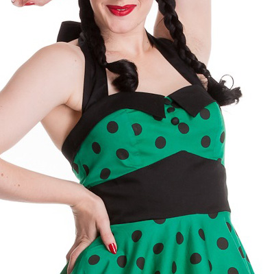 Renueva tu look con el color de la temporada: Este vestido pin up lo tiene todo. En color verde con lunares y adornos en negro para crear un contraste altamente favorecedor.