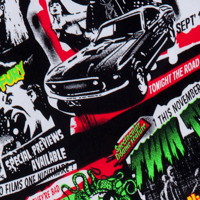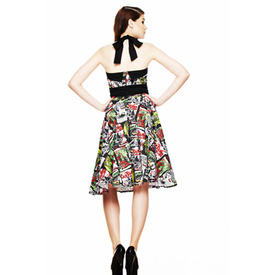 Vestido estilo años 50 con estampado de carteles de supuestas películas de serie B.