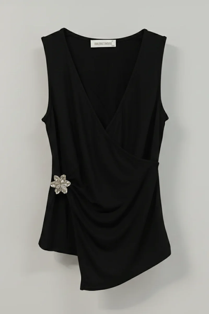 Esta blusa es la pieza perfecta para quienes buscan un equilibrio entre elegancia clásica y un toque deslumbrante. Su diseño envolvente no solo estiliza, sino que aporta un aire sofisticado ideal para eventos o una salida especial.