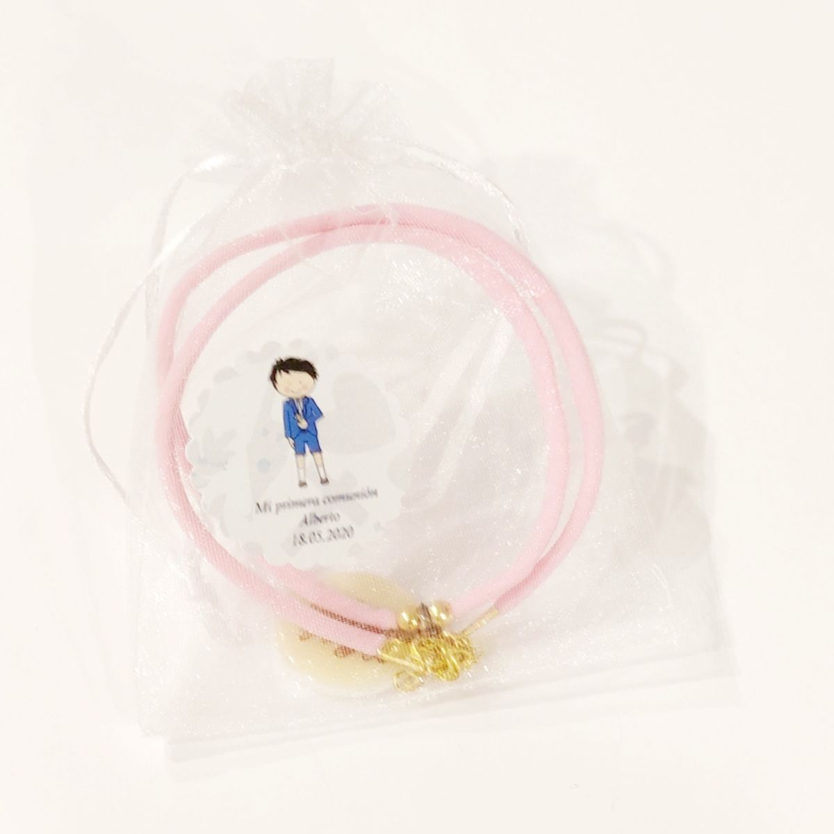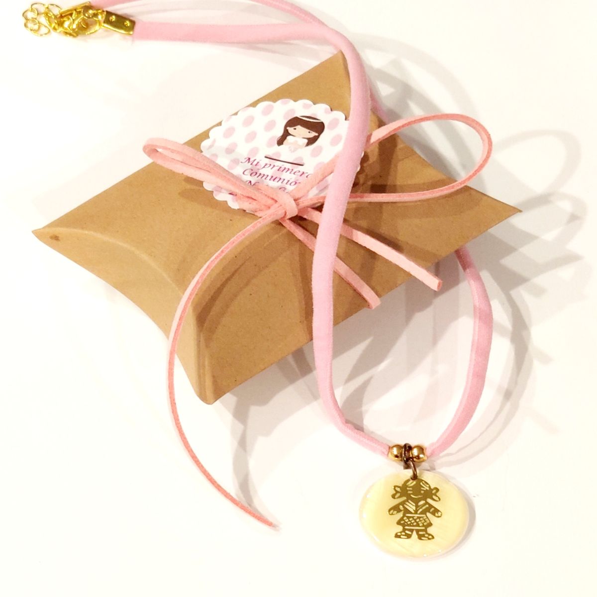 Regala estos bonitos collares a las invitadas a los eventos. ¡Quedan monísimos! Realizados con cordón de tela de 7mm en color rosa. En este caso con colgante en nácar redondo con niña dorada y terminales de acero con cierre en forma de mosquetón con cadena para alargar en caso de ser necesario, todo ello en acero también.