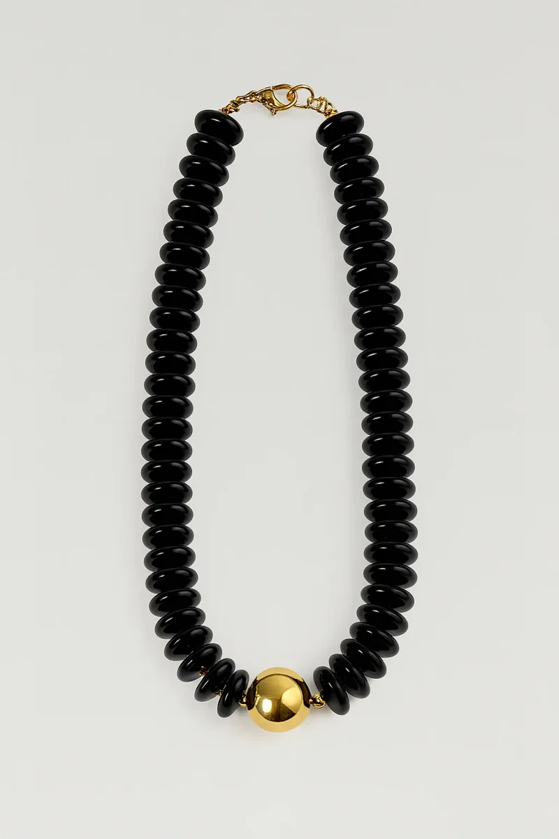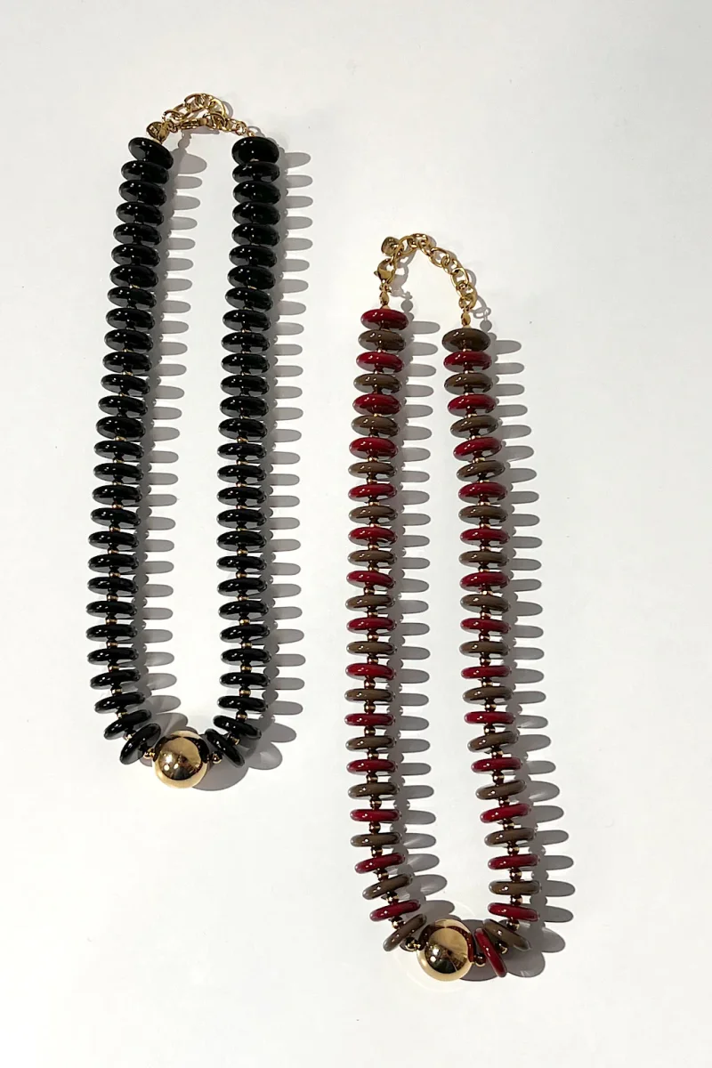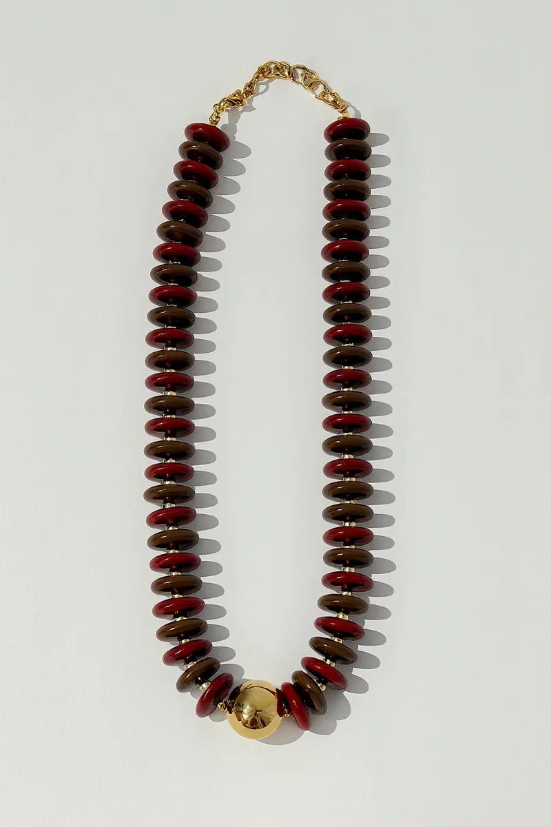 Collar elaborado en acero inoxidable con cuentas circulares de acabado brillante y un cierre en esfera metálica dorada que aporta un toque elegante y moderno. Disponible en dos versiones: negro intenso para un look sofisticado y en combinación de granate con marrón para un estilo más cálido y versátil. Perfecto para destacar tanto en ocasiones especiales como en conjuntos diarios con personalidad.