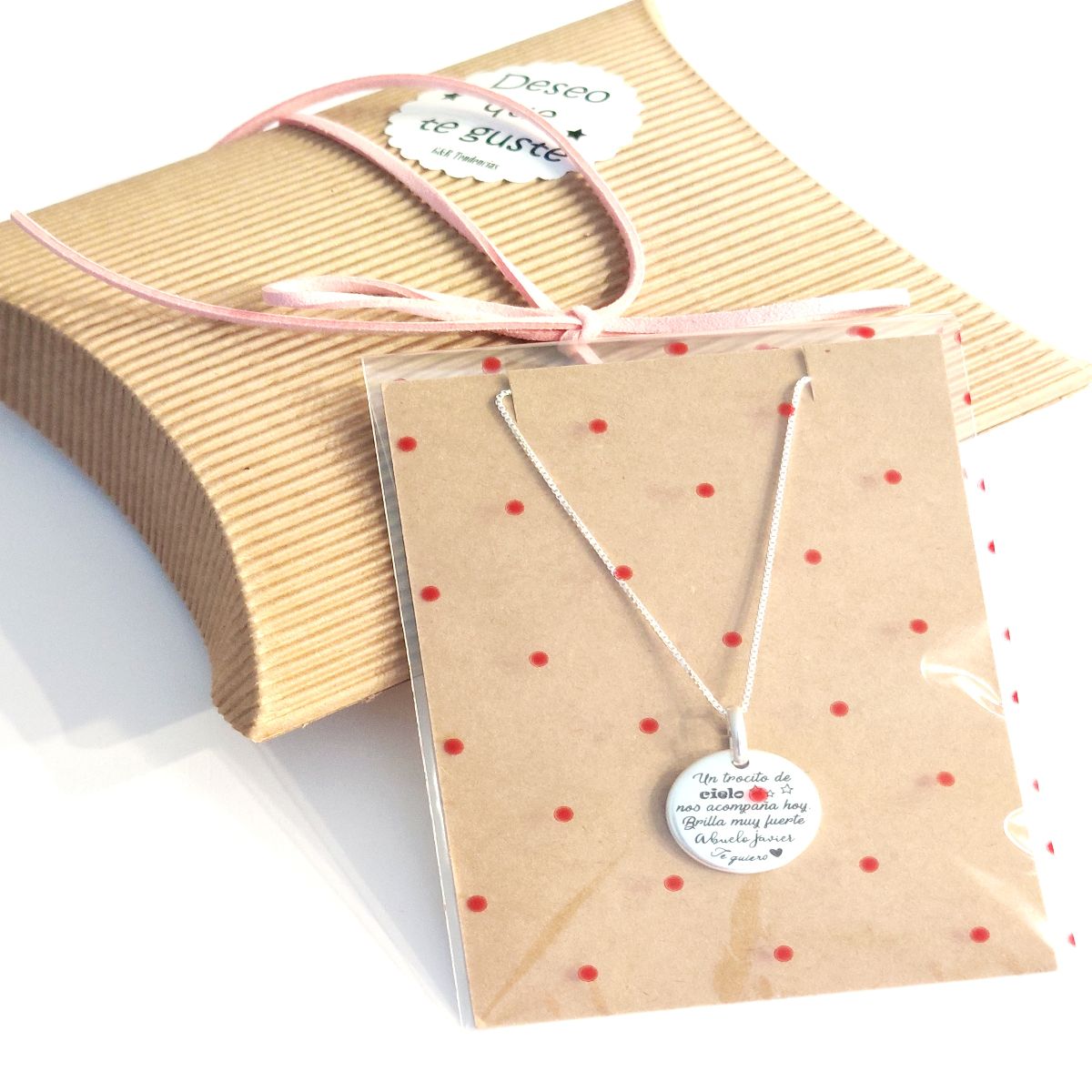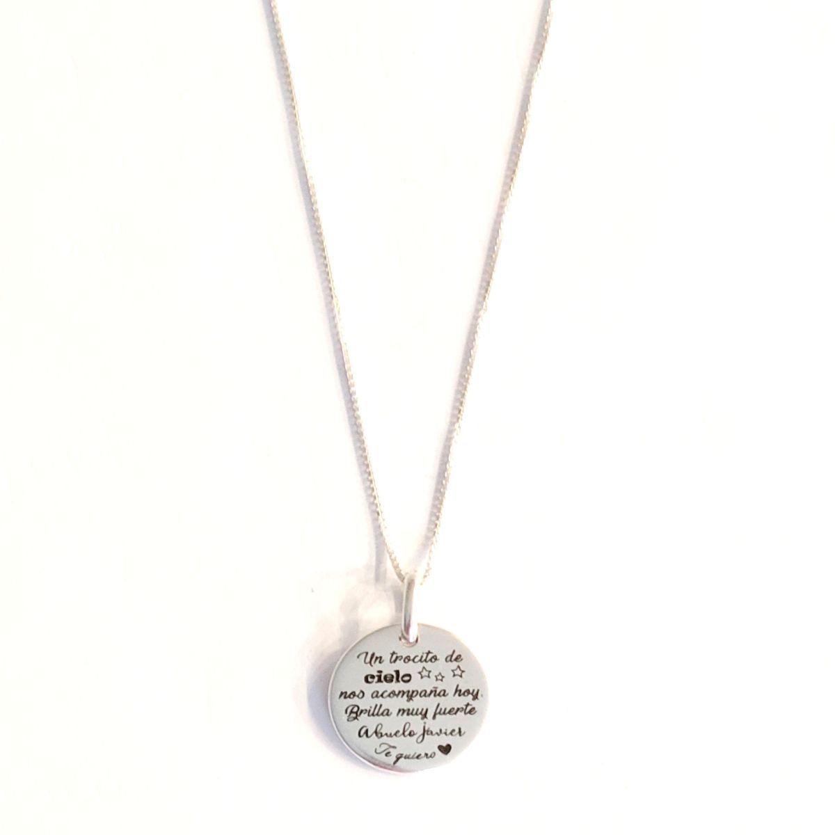 Esta gargantilla es preciosa para que lleve la niña en su comunión para recordar a las personas que faltan y tenerlas presente en su día. Realizada con cadena de plata de ley modelo rolo de 40cm con colgante chapa plata de ley de 18 mm de diámetro y anilla de plata de 6 mm de diámetro.