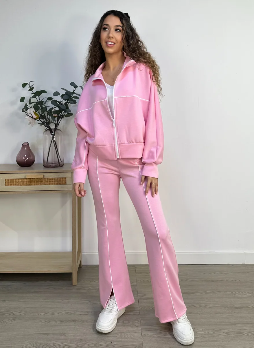 Conjunto chandal rosa con 95% viscosa y 5% elastano. Su tejido suave y elástico te proporcionará comodidad y libertad de movimiento mientras practicas deporte o realizas tus actividades diarias. Ideal para un look deportivo y femenino.