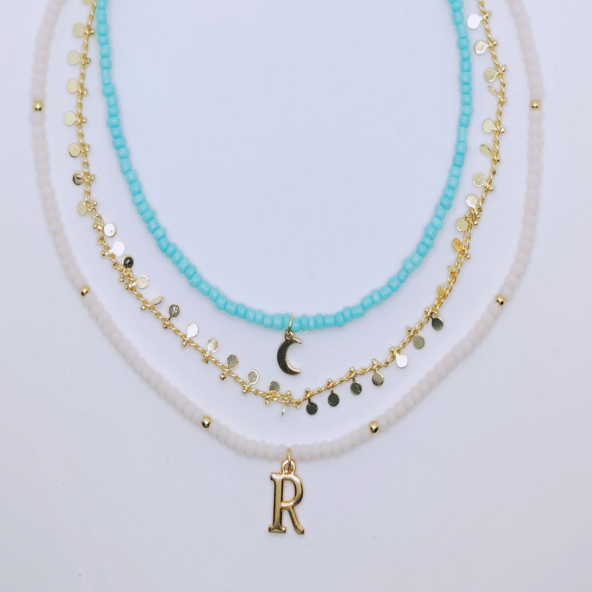 Lleva contigo este bonito conjunto de collares realizado con piedras facetadas en color beige con la inicial de zamak con baño dorado de 13mm, cadena de latón chapada en dorado con colgantes redondos y collar de rocalla en color verde agua con colgante en acero, todos ellos con cierres de acero dorados.