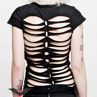 Esta camiseta tiene escote en pico y esta adornada con encaje negro en el escote, mangas y laterales.