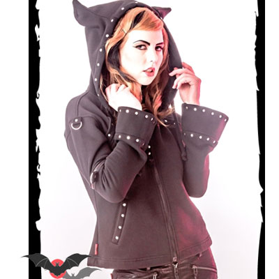 Chaqueta heavy metal polar tipo sudadera negra con multitud de adornos metálicos y capucha con picos imitando orejas.