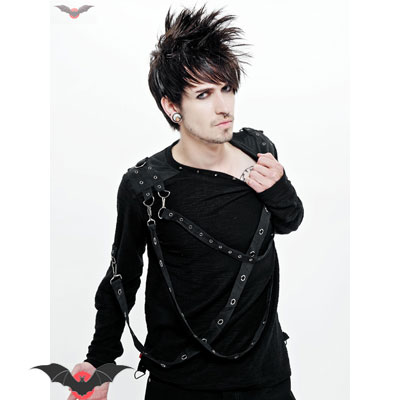 Jersey de hombre dark rock de manga larga de cuello amplio con correas de dos tipos con argollas en negro grafito en el frontal.