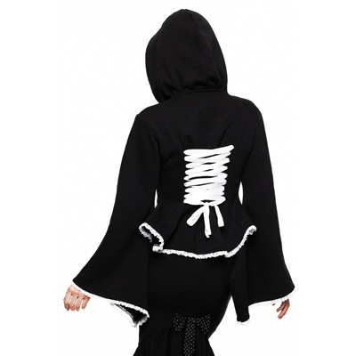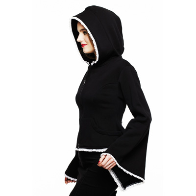 Kimono sudadera con capucha en color negro con encajes blancos.