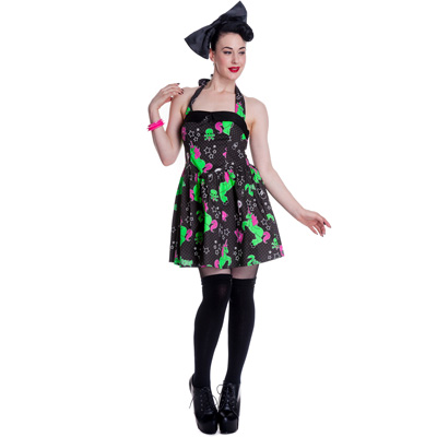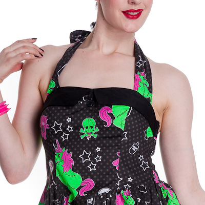 Si estas harta de llevar vestidos sin ninguna originalidad, entonces estas preparada para llevar este vestido punk corto con estampado de pequeños ponys zombies, ositos de peluche siniestros, ojos, estrellas y calaveras entre otras cosas. Estos estampados están sobre un fondo negro con lunares gris oscuro.