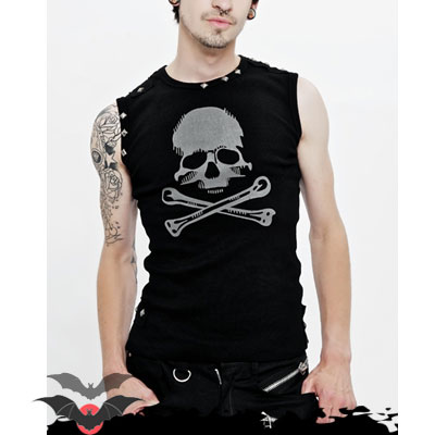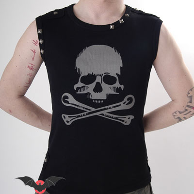 Los detalles en esta camiseta sin mangas están muy cuidados, por ejemplo, la parte frontal del cuello, hombros, mangas y laterales inferiores hay tres tachas en pirámide roma en color plata vieja.