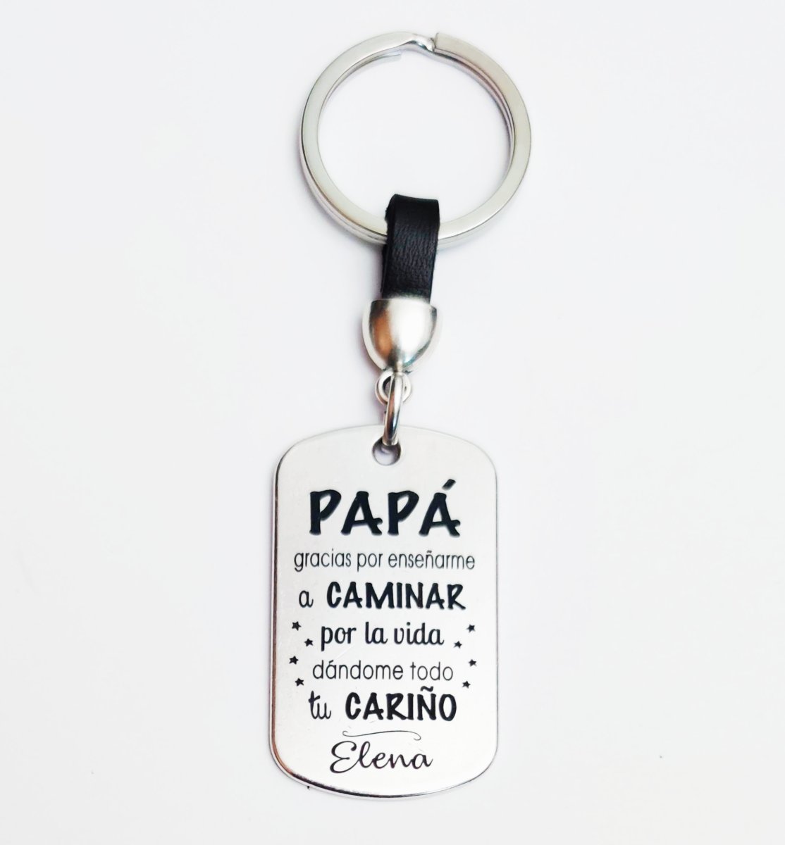 Qúe manera más bonita de darle las gracias a tu padre por estar ahí siempre con este llavero realizado con chapa rectangular de 48x28mm de zamak bañada en 8 micras de plata y anilla para llavero de 20mm de diámetro. Opciones de acabado en cuero plano de 10mm, tela de colores de 10mm o cordón redondo de 6mm
