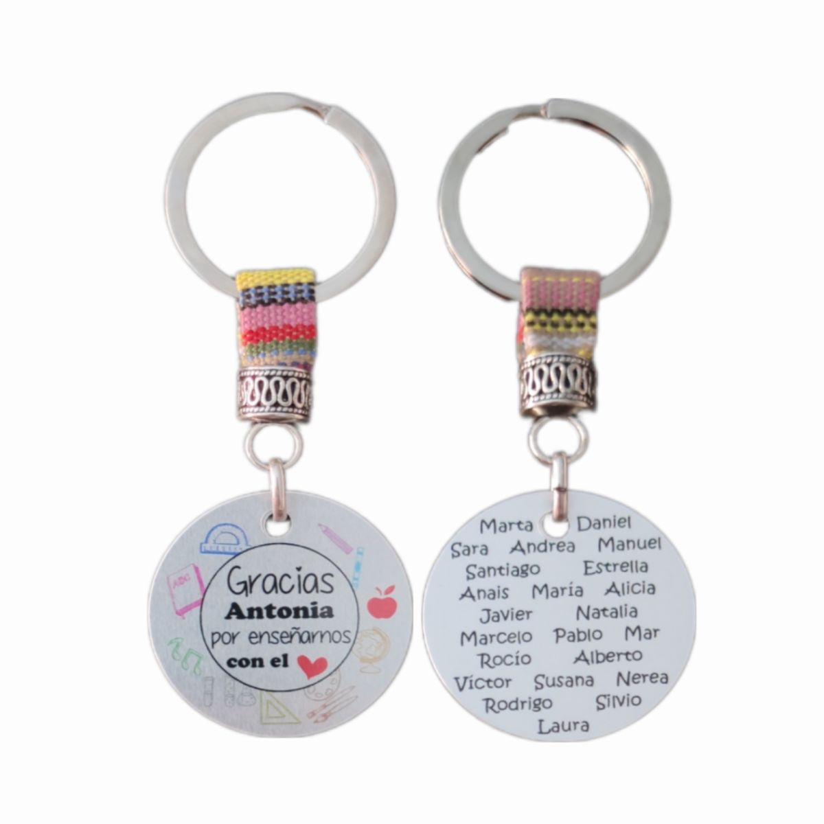 Un bonito regalo para la profesora para darle las gracias, realizado con chapa redonda de 3omm de diámetro de alumino y anilla para llavero de 20mm de diámetro. Opciones de acabado en cuero plano de 10mm, tela de colores de 10mm o cordón redondo de 6mm.