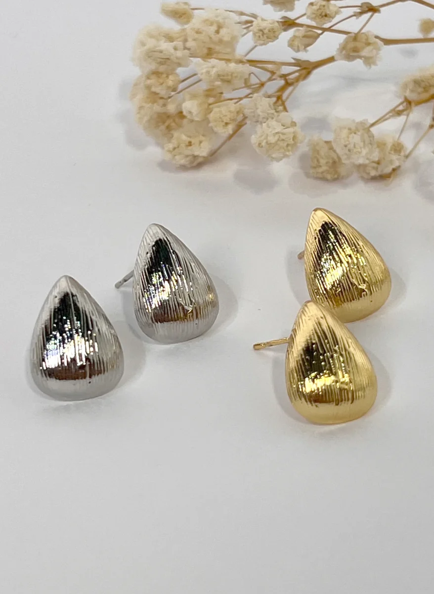 Pendientes pequeños con forma de gota y acabado texturizado que refleja la luz de forma delicada. Su diseño elegante con líneas finas grabadas aporta un aire moderno y sofisticado. Fabricados en acero inoxidable, destacan por su ligereza y comodidad, perfectos para llevar durante todo el día. Disponibles en acabado dorado cálido o plateado brillante.