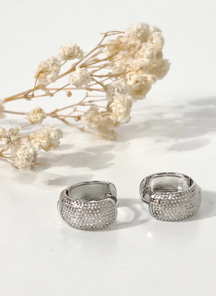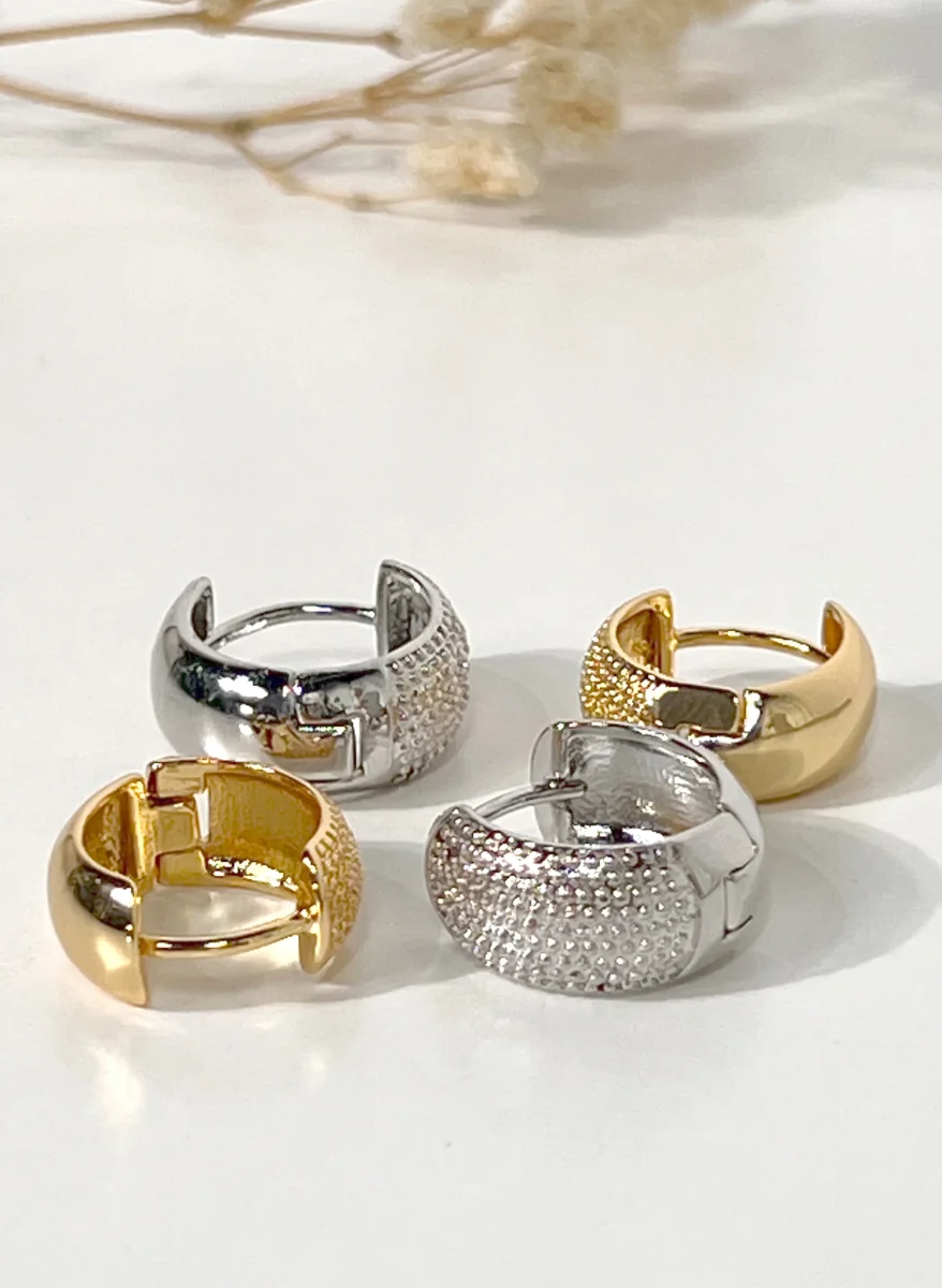 Aros tipo huggie de acero inoxidable, diseñados para abrazar el lóbulo de forma cómoda y segura. Su silueta semicircular es gruesa, compacta y ligeramente abombada, con un diámetro exterior de aproximadamente 1,5 cm, ideal para quienes buscan pendientes pequeños pero con presencia.