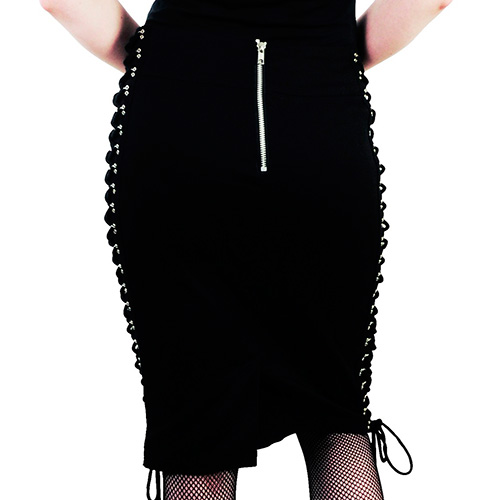 Original falda de tubo estilo steampunk en negro y de tejido ligeramente elástico. A ambos lados unos adornos metálicos sirven de soporte al cruzado en zig zag de unos cordones.