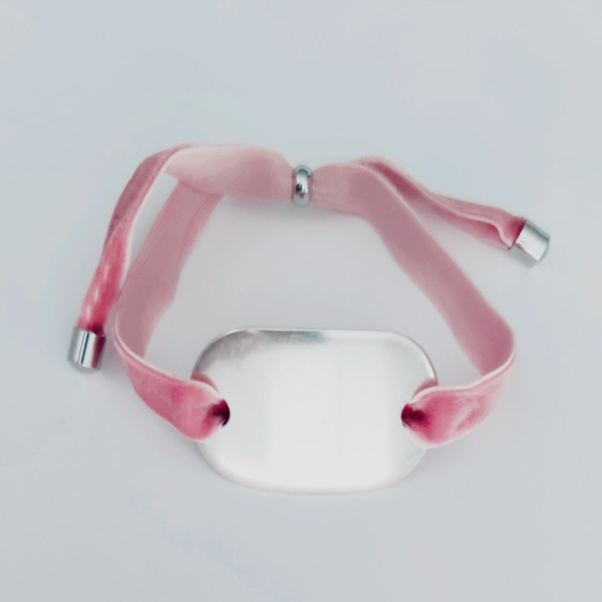 Graba en esta pulsera la dedicatoria que quieras para esa persona tan especial. Realizada con entrepieza chapa ovalada de 24x38mm de zamak bañada en 8 micras de plata y cinta elástica de terciopelo ajustándose a la muñeca con bola de acero y en los extremos topes de acero.
