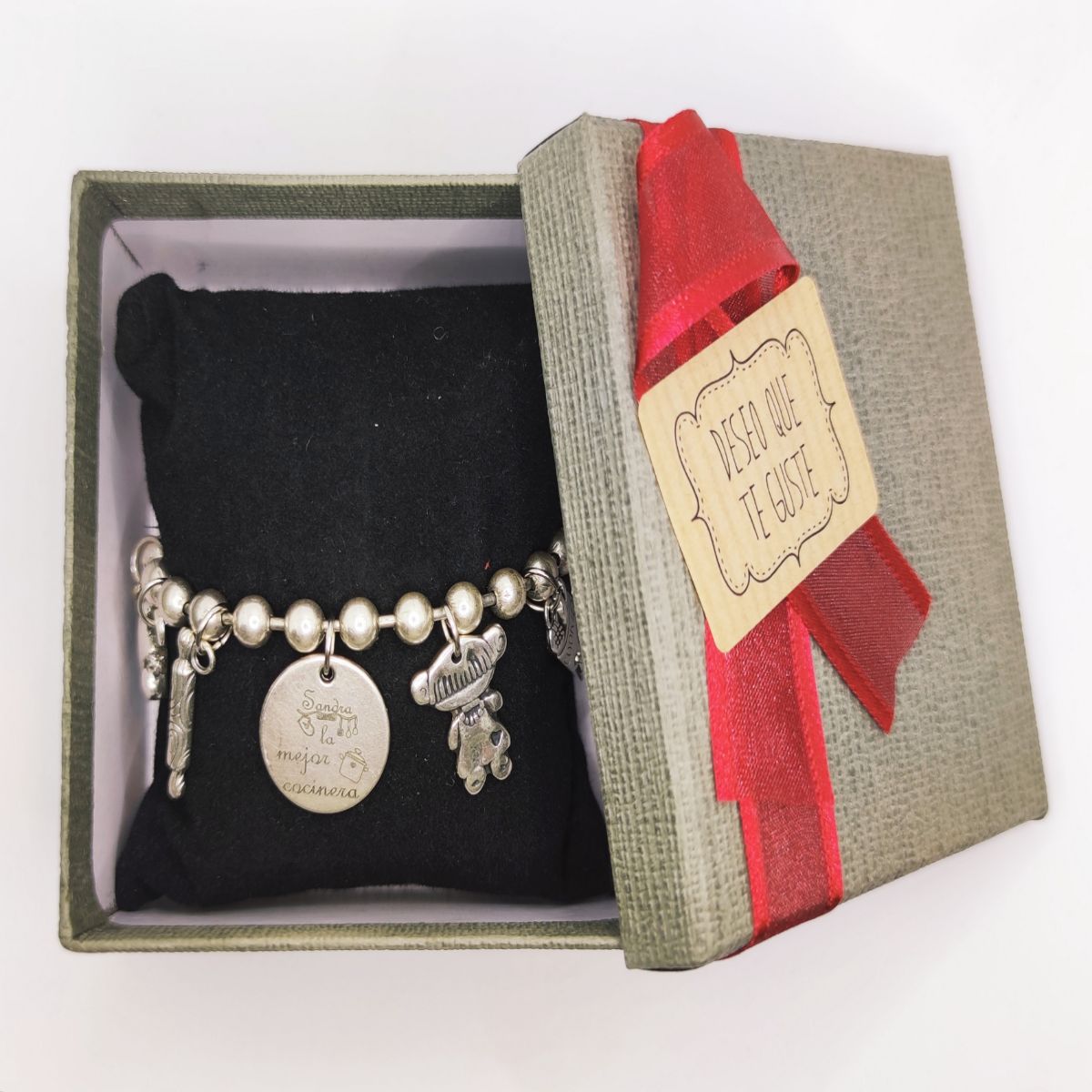 Esta pulsera es perfecta como agradecimiento a la gran cocinera, con abalorios que hacen referencia a dicha profesión que tanto apasiona, realizada con cadena de bolas de 6mm con baño de plata de alta calidad, chapa de zamak de 20mm bañada en 8 micras de plata, colgantes de zamak bañados en 8 micras de plata y cierre de zamak de 16x8mm con baño de plata.