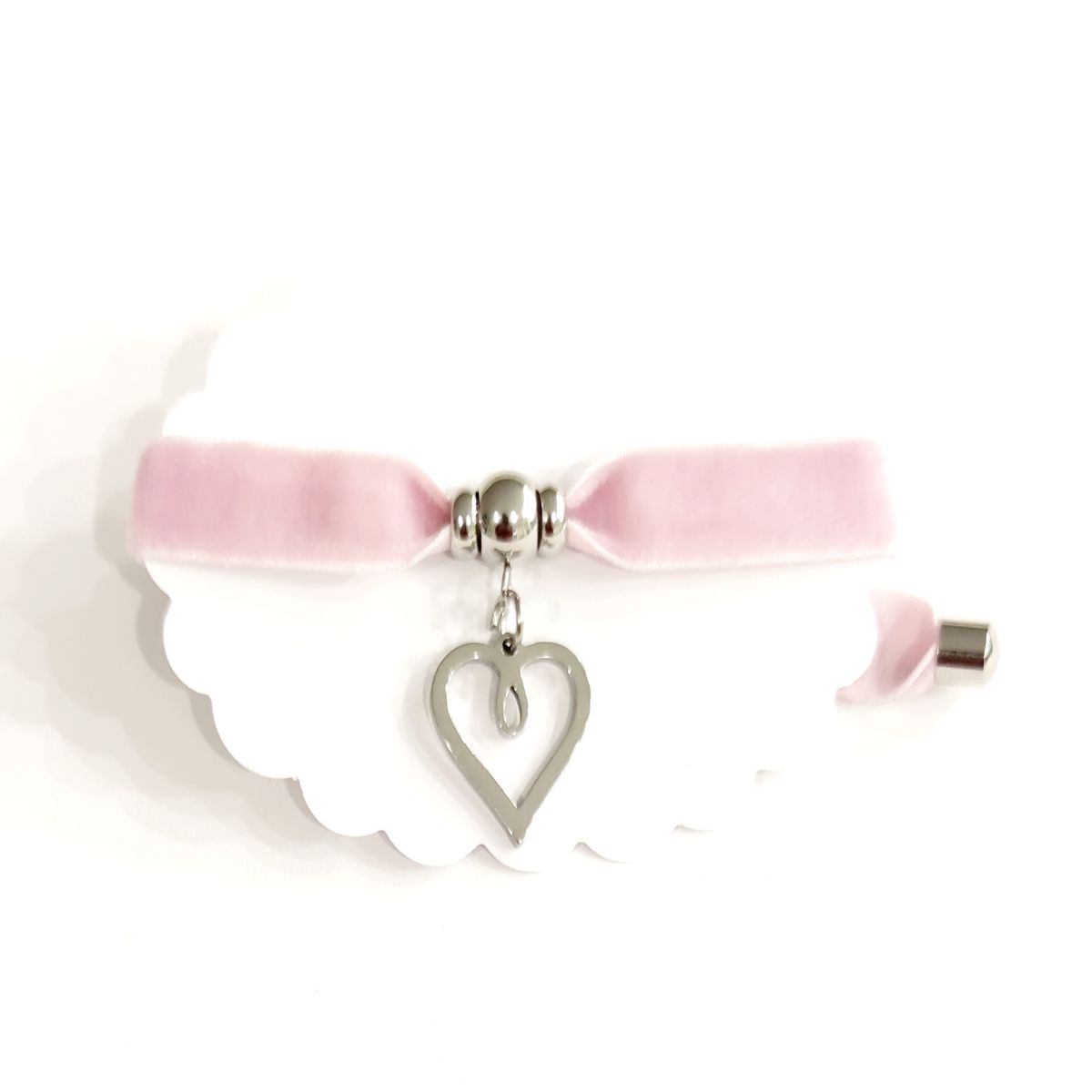 Regala esta pulsera con el colgante corazón, realizada con cinta elástica de terciopelo, bolas de acero y ajustándola a la muñeca con otra bola de acero y en los extremos topes de acero.