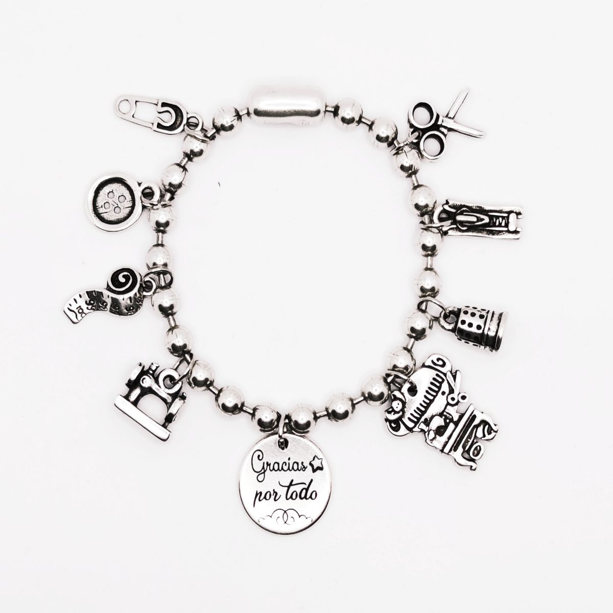 Esta pulsera es perfecta como agradecimiento a esa gran costurera, con abalorios que hacen referencia a dicha profesión que tanto apasiona, realizada con cadena de bolas de 6mm con baño de plata de alta calidad, chapa de zamak de 20mm bañada en 8 micras de plata, colgantes de zamak bañados en 8 micras de plata y cierre de zamak de 16x8mm con baño de plata.