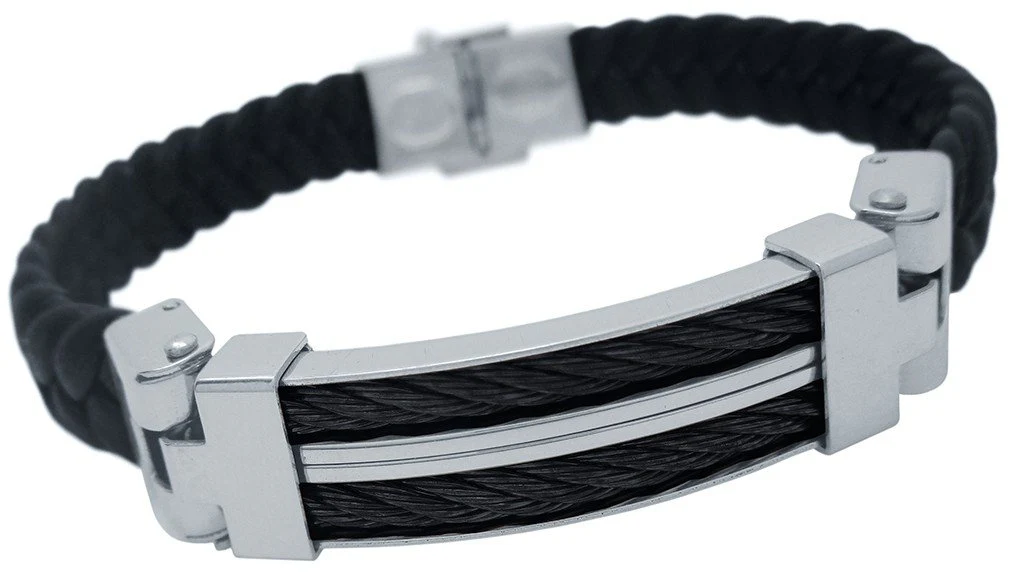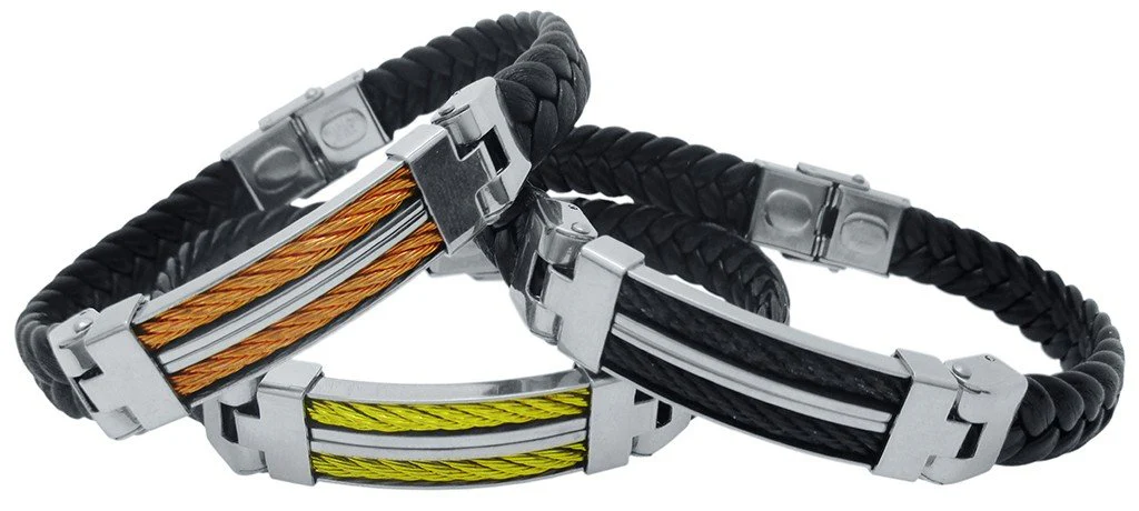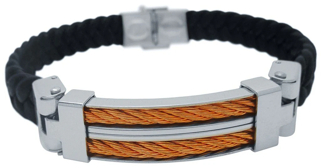Pulsera para hombre fabricada artesanalmente en cuero trenzado, su parte central de acero inoxidable y antialérgico, con un diseño dinámico y sólido con detalle de doble cordón trenzado de acero (en color oro, cobre o negro). Es una pieza muy juvenil y elegante. Su diseño concede a quien lo lleva una elegancia fuera de lo común. Cierre de acero con pestaña de seguridad. Longitud ajustable.