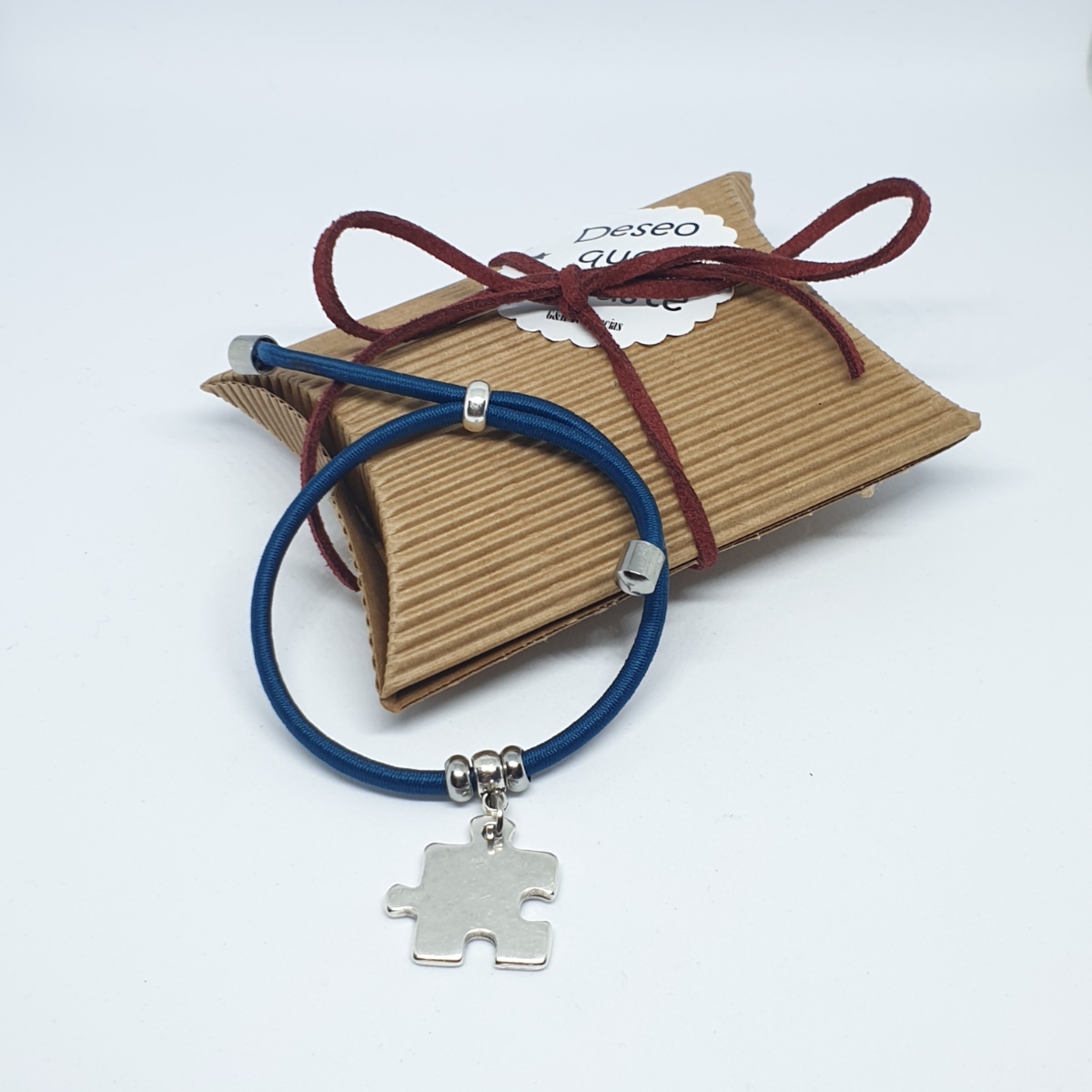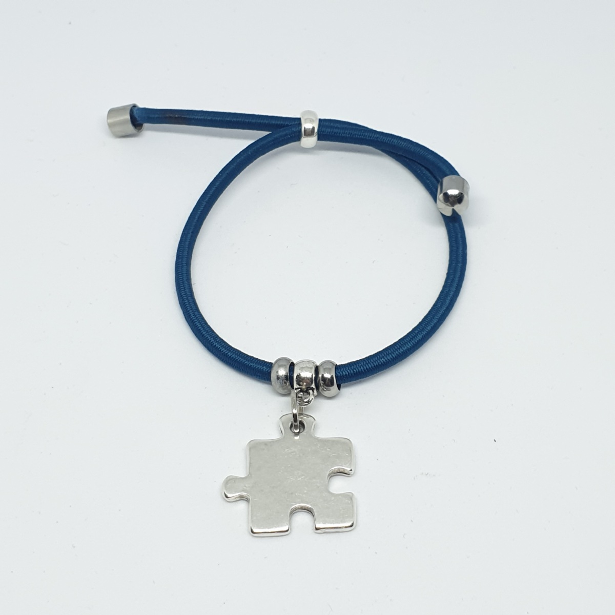 Personaliza esta pulsera con la frase que elijas para tí o para esa persona especial, con piezas de puzzle de 21x20mm bañadas en 8 micras de plata, con goma elástica ajustable de color azul de de 3mm ajustándola a la muñeca con bola de acero y en los extremos topes de acero.