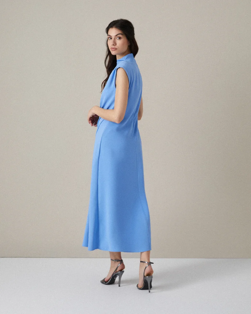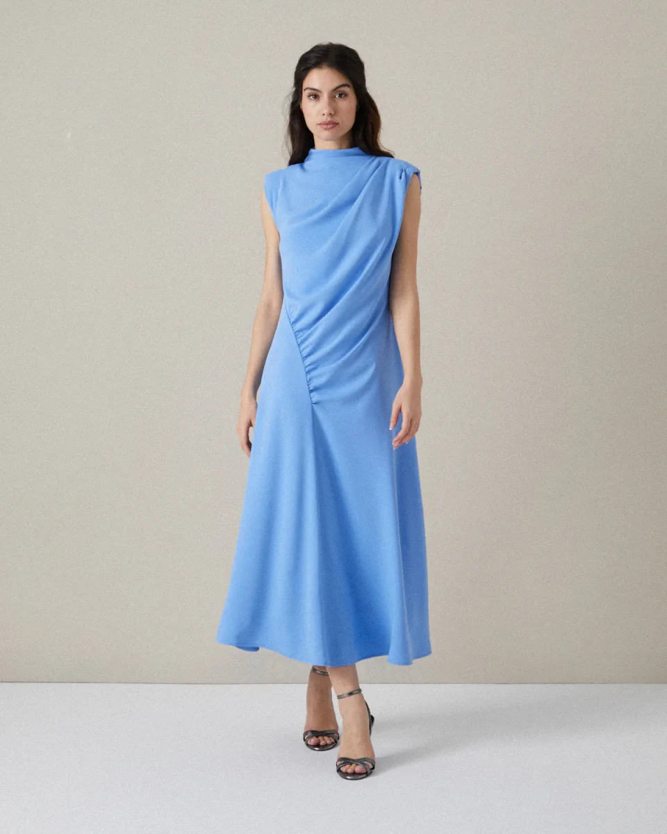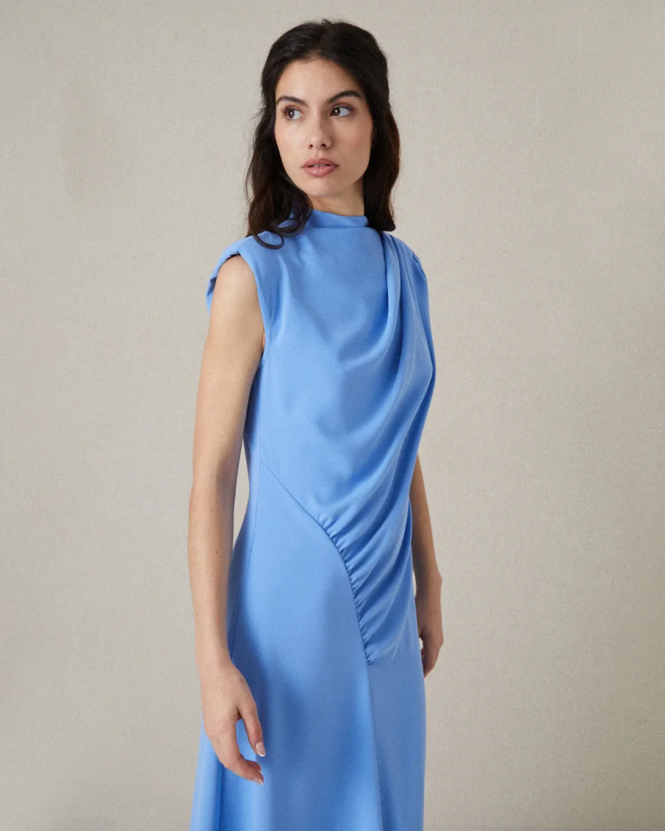 VESTIDO CON CUELLO ALTO, HOMBRERAS Y FRUNCIDO ASIMƒTRICO EN LA CADERA