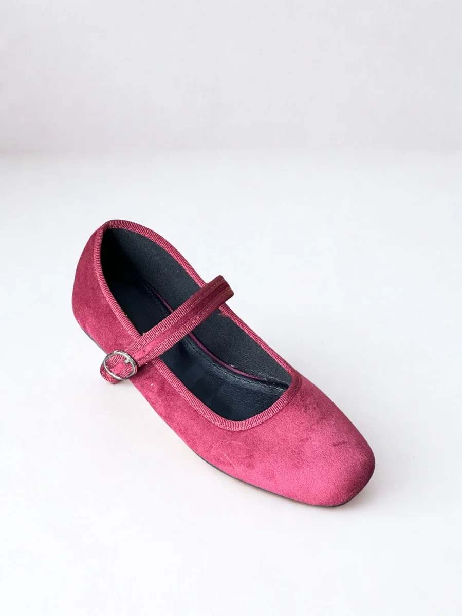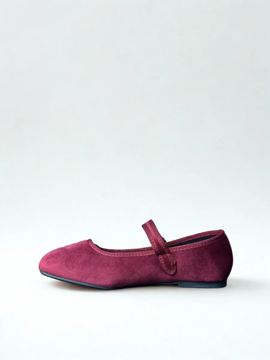 Zapato plano estilo bailarina. Cinta en empeine y cierre cinturón. Suela plana, cómoda y flexible. Acabado en punta cuadrada y efecto antelina. Disponible en color wine, green, negro, grey/wine, blue y brown.