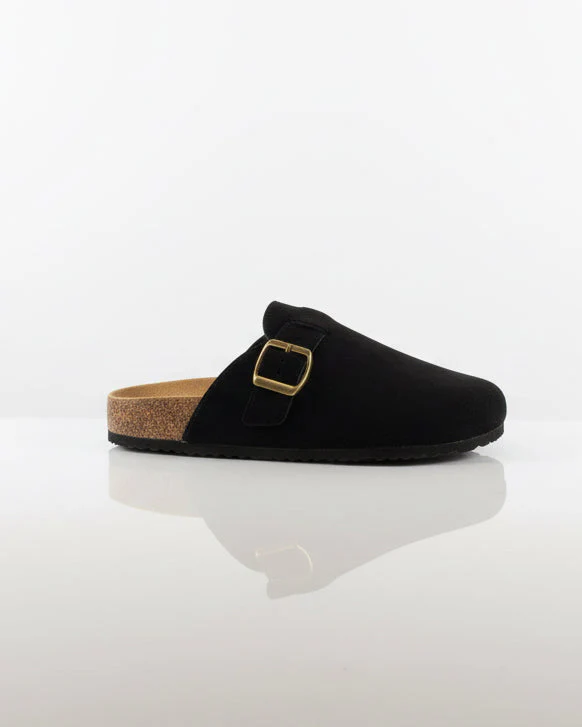 Zueco con hebilla dorada, con forro textil interior. Aaltura de suela de 3 cm. Muy cómodos para tus outfit más casual!